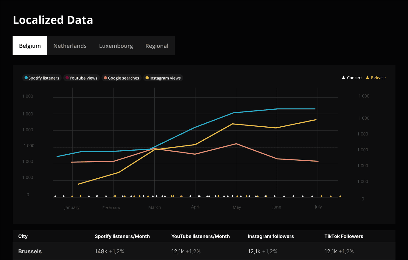 Bookers needed answers to very practical questions. Is this artist popular in Belgium? Which cities? What does their airplay look like? Are they growing or fading? Is this venue the right size?