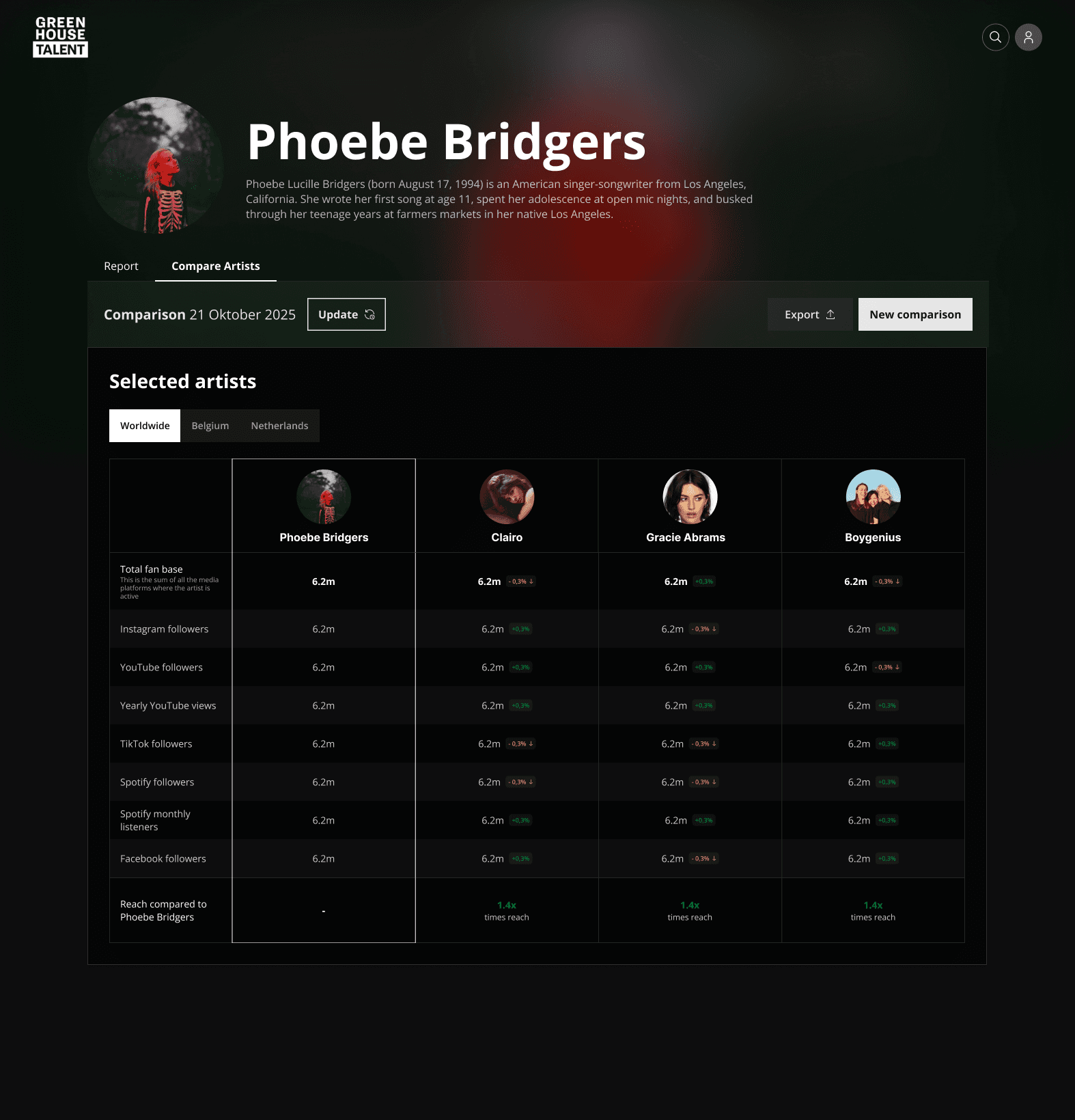 Greenhouse Talent is an international concert promoter and booking agency. For them, data isn't decoration. It drives booking decisions.